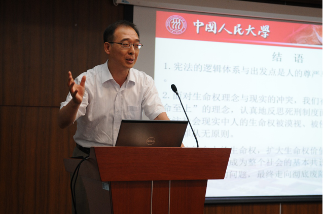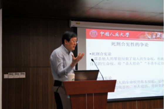 之后,韩大元教授以提问的形式结合生命权引出了此次讲座的主题——“死刑制度的宪法控制”。韩教授提出了一个问题供大家思考,即宪法学为什么要关注死刑制度?他指出死刑是国家行使刑罚权的极端形式,意味着合法地剥夺公民生命权,该权力的行使必须受到宪法控制,国家不应该允许死刑的冤案错案。而且死刑制度关系中国法治的走向与国际形象。