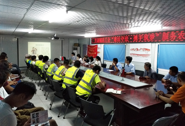 南开新闻网讯(通讯员 霍萌)今年8月,由全国总工会与教育部联合发起、天津市总工会指导的“尊法守法·携手筑梦”服务农民工法治宣传行动在津启动,我校工会及学院师生组成5个服务队,深入滨海新区农民工相对集中的地域进行法治宣传和服务工作。9月25日,我校服务队分别到滨海新区东疆保税区、中新生态城的工地开展法制宣传活动。