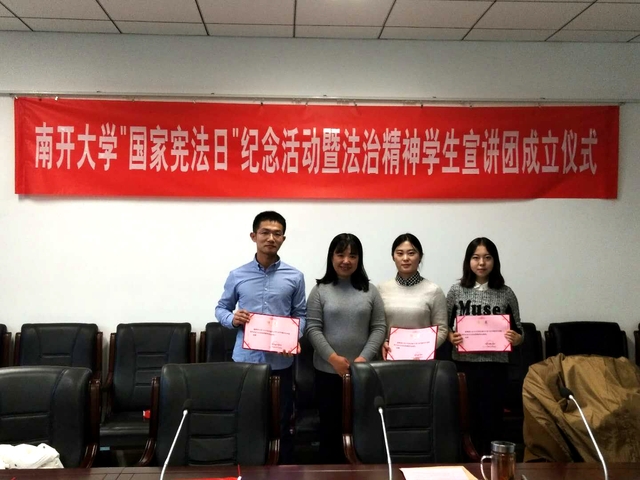 (通讯员 姚阿敏)为深入贯彻十九大精神,鼓励法学青年积极参与深化依法治国实践,在大力开展全民普法,帮助公民树立法律意识,建设中国特色社会主义法制体系方面发挥学院专业优势,学院学生在第四个国家宪法日的下午,依托学院学生自办刊物《南开法律评论》,成立了我校习近平新时代社会主义法治思想学习研究会,并成立我校法治精神学生宣讲团。