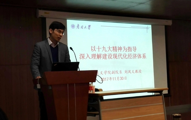 (通讯员 艾伟俊 李美郡)为贯彻落实学校党委认真做好党的十九大精神宣讲工作通知的要求,进一步深入学习党的十九大精神,11月30日学院党委邀请学校党的十九大精神理论宣讲“教授团”成员、马克思主义学院副院长刘凤义教授作“以十九大精神为指导,深入理解建设现代化经济体系”主题报告。宣讲报告由学院党委副书记李悦主持,学院八十余名教师和学生党员参加。