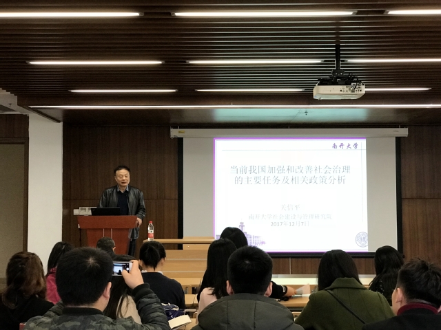 (通讯员 闻慧哲 艾伟俊 摄影 刘尧尧 陈珂)为贯彻落实学校党委认真做好党的十九大精神宣讲工作通知的要求,进一步深入学习党的十九大精神,12月7日学院党委邀请学校党的十九大精神理论宣讲团成员、周恩来政府管理学院关信平教授作“当前我国加强和改善社会治理的基本要求和相关政策”主题报告。宣讲报告由学院党委副书记李悦主持,学院教师和学生党员、积极分子参加。