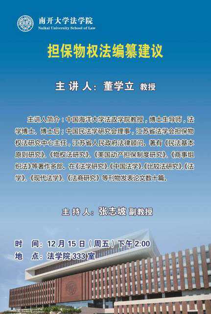 主讲人简介:中国海洋大学法政学院教授,博士生导师,法学博士、博士后;中国民法学研究会理事,江苏省法学会担保物权法研究中心主任,江苏省人民政府法律顾问。著有《民法基本原则研究》、《物权法研究》、《美国动产担保制度研究》、《商事组织法》等著作多部。在《法学研究》、《中国法学》、《比较法研究》、《法学》、《现代法学》、《法商研究》等刊物发表论文数十篇。