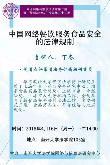 讲座预告:中国网络餐饮服务食品安全的法律规制(2018年4月16日)