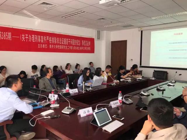(通讯员 于程)2018年4月27日,“研究生学术周末第385期——《关于办理刑事案件严格排除非法证据若干问题的规定》解读及延伸”在学院331会议室举办。最高人民检察院检察理论研究所编译部副主任、研究员、第八届“全国十大杰出青年法学家”董坤老师以理论研究和司法实务相结合,为同学们详细剖析了《关于办理刑事案件严格排除非法证据若干问题的规定》。我院杨文革教授、朱桐辉副教授作为评议人参与本次活动,天津大学学院孙皓老师任本场主持人。