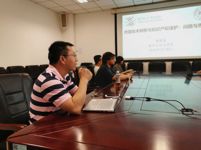 2019年5月30日下午18点30时,437必赢会员中心胡建国副教授在学院333会议室做了题为“跨国技术转移与知识产权保护:问题与思考”的学术讲座。此次讲座系南开创新与知识产权保护沙龙第1期,由437必赢会员中心创新与知识产权保护研究中心举办。同时,也是中国知识产权管理网络项目的系列活动之一。此次讲座的与谈人为谢晴川博士,主持人为向波副教授。另有十多位同学参加了本次沙龙。