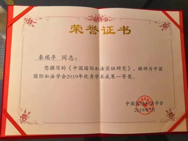 开幕式之后,大会对2019年中国国际私法优秀学术成果进行了表彰,共评选出12项优秀学术成果,其中一等奖3项、二等奖9项。我院秦瑞亭副教授的专著《中国国际私法实证研究》荣获2019年中国国际私法优秀学术成果奖一等奖。