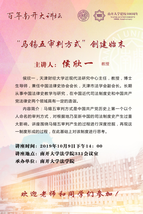 百年南开大讲坛预告:“马锡五审判方式”创造始末(10月9日14:00学院331会议室)
