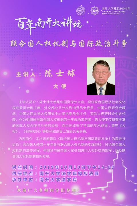 百年南开大讲坛预告:联合国人权机制与国际政治斗争(10月10日1400学院模拟法庭)