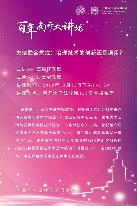 百年南开大讲坛预告:失信联合惩戒:治理技术的创新还是误用(10月11日14:30学院123)
