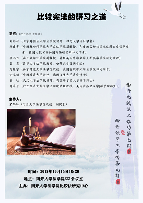 南开比较法工作坊第七期暨南开法学工作坊第九期预告:比较宪法的演习之道(2019年10月15日18:30学院331会议室)