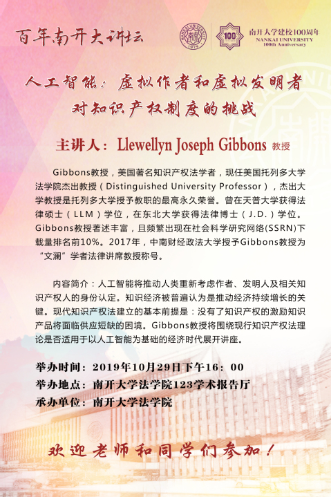南开百年大讲坛预告:人工智能:虚拟作者和虚拟发明者对知识产权制度的挑战 (10月29日16:00学院123)