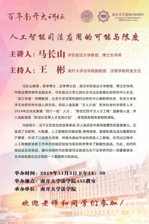 百年南开大讲坛预告:人工智能司法应用的可能与限度(11月3日下午14:30学院455)