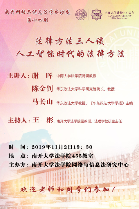 南开网络与信息法学术沙龙第十四期:法律方法三人谈人工智能时代的法律方法(11月2日19:30学院455)