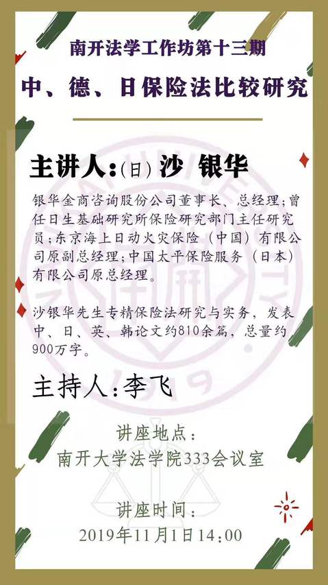 南开法学工作坊第十三期:中、德、日保险法比较研究(11月1日14:00学院333)