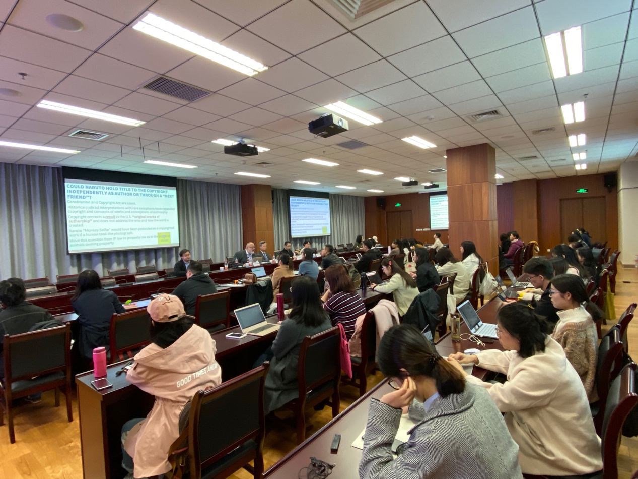 Gibbons教授的主题演讲生动形象地展现了人工智能的发展以及人工智能对于未来人类生活工作的深入影响。Gibbons讲座由浅入深引导在场学生深入理解人工智能经济所需要的激励并非现代知识产权制度所能满足。在讲座开始,Gibbons教授在时间维度上对近40年来部分发达国家及世界知识产权组织的法律和政策文件进行梳理,展示了人类有关计算机等虚拟主体创作权、发明权的认识在近40年间经历了巨大的变化。20世纪70年代到90年代普遍认为不应赋予虚拟主体创作性、发明性权利,而近年来国家和国际层面都在重新定义虚拟主体的发明、创作权的归属问题。