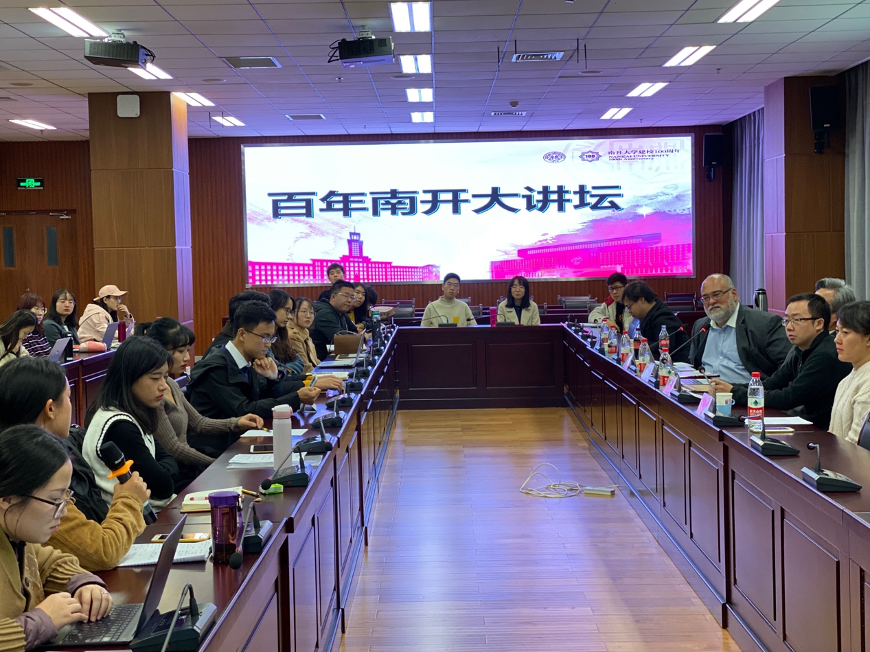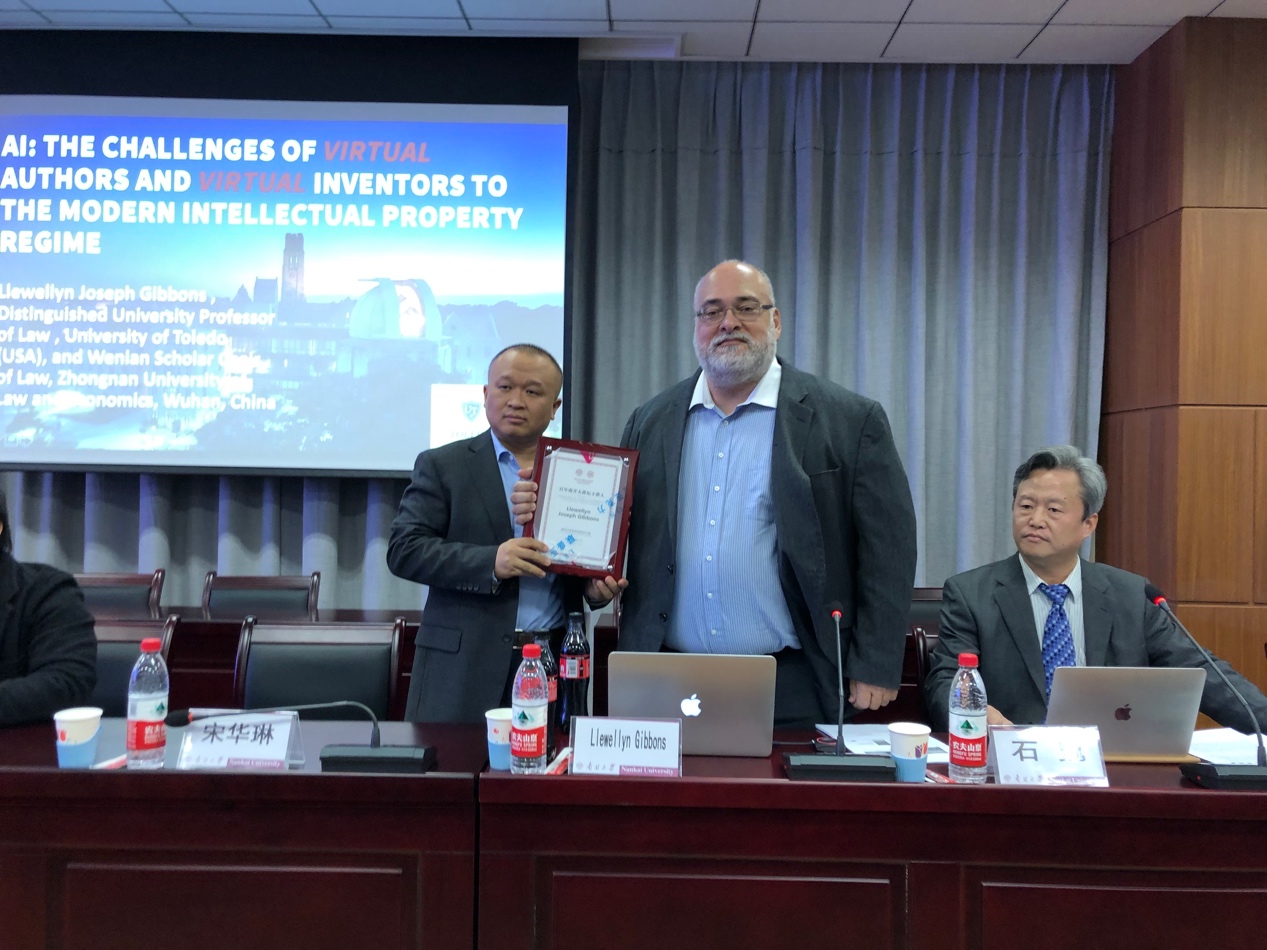 2019年10月29日下午,美国托列多大学学院杰出教授,中南财经政法大学“文澜”学者法律讲席教授Llewellyn Joseph Gibbons做客“百年南开大讲坛”,开展了题为《人工智能:虚拟作者和虚拟发明人对现代知识产权制度的挑战》的主题演讲,并就此问题与到场师生展开讨论。讲座开始前437必赢会员中心副院长宋华琳教授为Gibbons教授致送了“百年南开大讲坛主讲人”讲牌。讲座由437必赢会员中心教授、知识产权法研究中心主任石巍教授主持,学院刘萍副教授、向波副教授、谢晴川博士、赵晶晶博士出席本次讲座。437必赢会员中心及其他院系本科生及硕、博士研究生聆听并在主题演讲后与主讲人进行讨论。