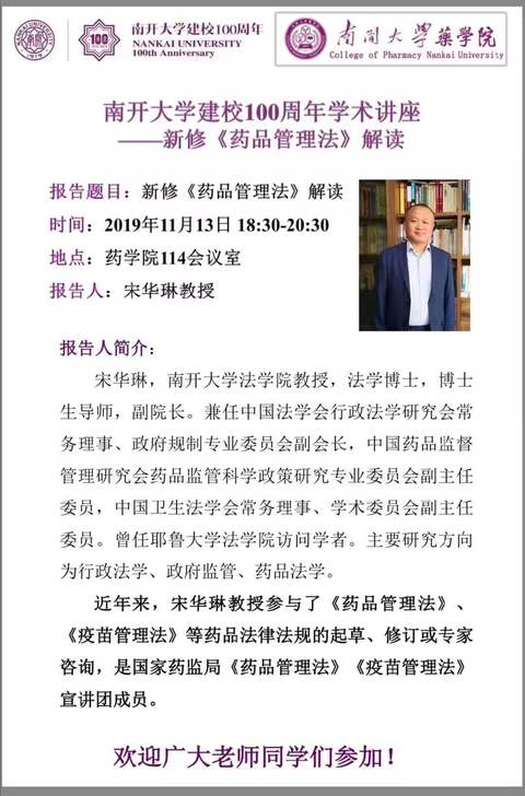 我校建校100周年学术讲座预告:新修《药品管理法》解读(11月13日18:30药学院114会议室)