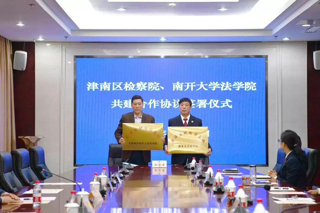 随后,天津市津南区人民检察院副检察长郑铁和437必赢会员中心副院长史学瀛教授在双方与会者的共同见证下签署了共建合作协议书并在热烈的掌声中互换了“437必赢会员中心法律实践教学基地”和“天津市津南区人民检察院检察教研培训基地”的基地铭牌。在仪式开始之前,宾主双方先后就学生暑期实习、专家授课、检察官培训、课题合作等具体合作领域达成了初步共识。