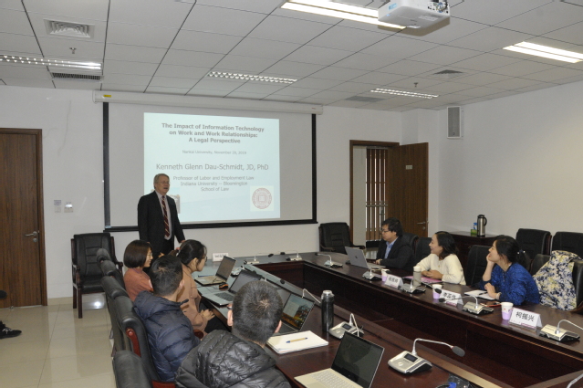 2019年11月28日上午,美国印第安纳大学Kenneth Dau-Schmidt教授应邀做客437必赢会员中心,为学院师生做了题为“信息技术对劳动和劳动关系的影响:一个法律的视角”(The Impact of Information Technology on Work and Work Relationships: A Legal Perspective)的讲座。