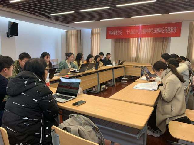 (通讯员 邵伯峰)11月28日,由学院2019级法学硕士党支部承办的第57期“鸣响”学术沙龙开展十九届四中全会精神中的法律前沿解读在学院455召开。支部成员围绕“运用宪法”的法理逻辑与司法实践、总体国家安全观、完善生态环境损害赔偿制度,推动生态文明制度体系建设等方面展开。2019级法学硕士党支部党员、入党积极分子参加,学院王瑞雪老师受邀进行点评,研讨由2019级法学硕士党支部书记郭光坤主持。