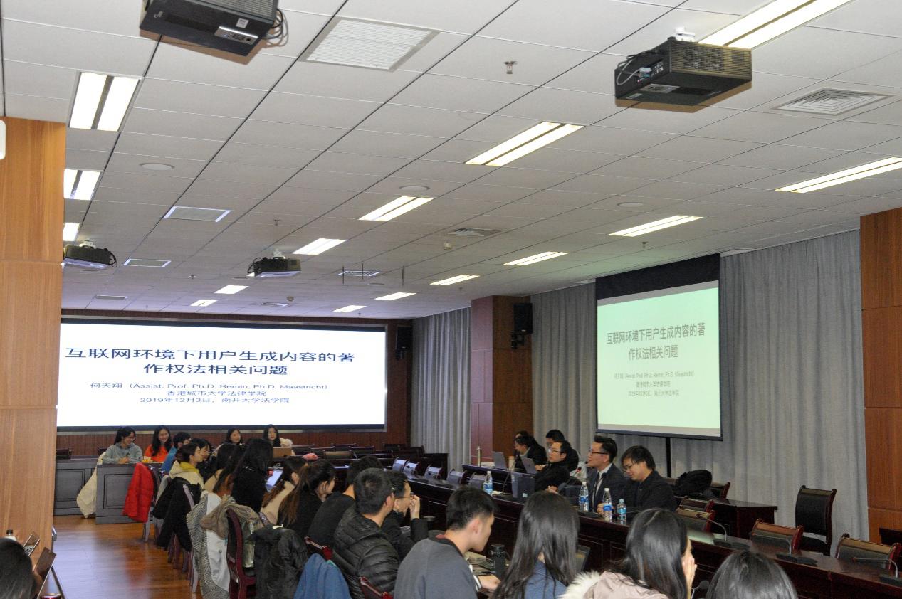 2019年12月3日晚上,香港城市大学法律学院助理教授、荷兰马斯赫里赫特大学博士、中国人民大学博士何天翔老师应邀做客第四期“南开创新与知识产权保护沙龙”,以“网络环境下的著作权使用与保护”为题,为我院师生带来了一场精彩的前沿讲座。本期活动由我校创新与知识产权保护研究中心主办,主持人为437必赢会员中心讲师谢晴川博士,437必赢会员中心向波副教授以及四十余位学生参与本次沙龙活动。