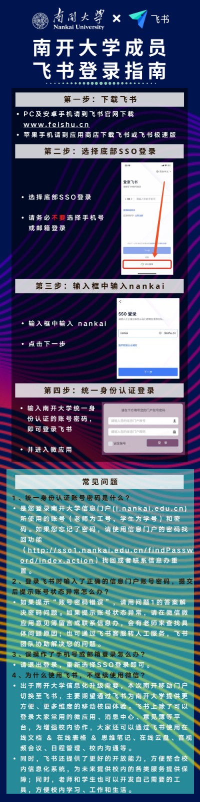 我校师生可从飞书官网(http://www.feishu.cn)或应用市场下载安装“飞书”或者“飞书极速版”并通过SSO登录的方式激活南开账号。具体方法是:在登录飞书/飞书极速版时点击登录页面底部的“SSO登录”按钮,在打开的SSO登录页里输入域名“nankai”,并点击下一步,然后通过验证我校信息门户账号密码来进行登录(只能通过此方法登录我校)。