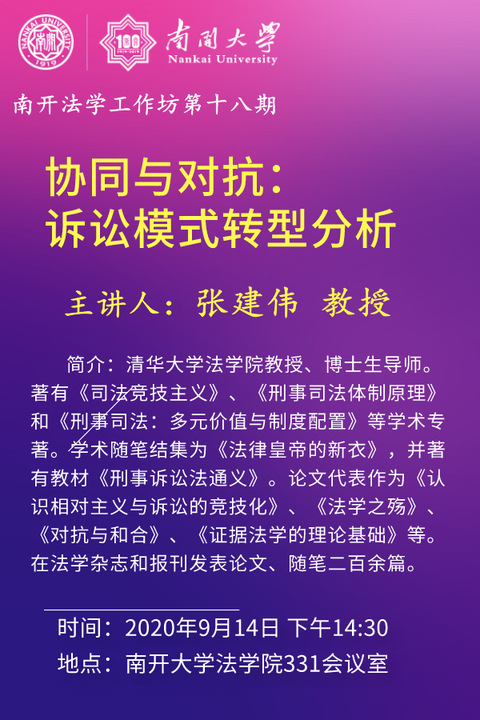 南开法学工作坊第十八期预告:协同与对抗:诉讼模式转型分析(9月14日14:30学院331)