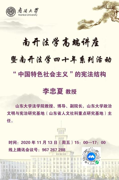南开法学高端讲座暨南开法学四十年系列活动预告:"中国特色社会主义”的宪法结构(李忠夏,11月13日15::00)