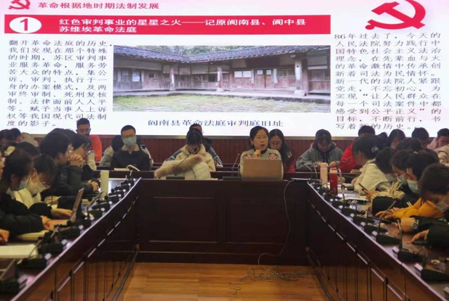 学院团委书记李高扬首先从“中国古代法制实践、革命根据地时期法制发展、新中国建立初期法制建设、新时代中国的法治成就”四个方面,讲授“学四史、不忘初心使命、传承法治精神”的主题团课。接着以“杨三姐告状”、“刘巧儿”等故事,多方面介绍了新中国建立初期审判组织建设,并从法治角度分析了为什么要坚持中国共产党的领导。在谈到新时代的法治成就时还提到了《民法典》的划时代意义,引起了在场学员们的极大兴趣。李高扬引导学员们要坚持中国共产党的领导、站在人民群众的立场思考、有集体意识、积极主动地参与社会实践。