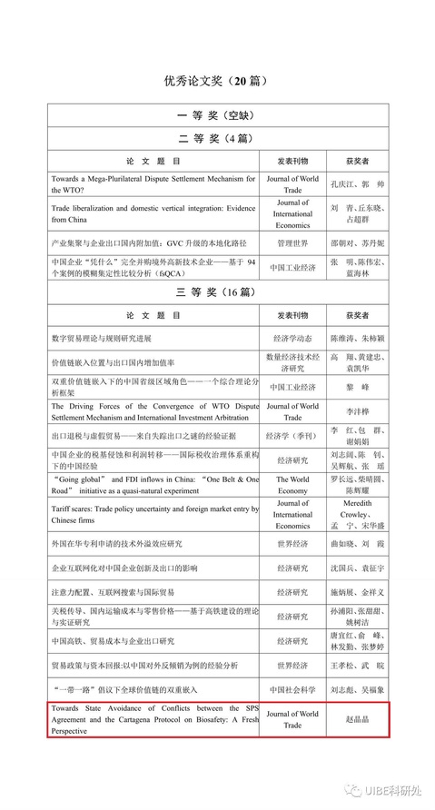 “安子介国际贸易研究奖”是中国国际贸易研究领域中的最高学术奖,被教育部认定为省部级奖,在国内外学术界具有较大影响。本届“安子介国际贸易研究奖”共评选出优秀论文20篇,其中一等奖空缺,二等奖4篇,三等奖16篇(同等级排名不分先后)。