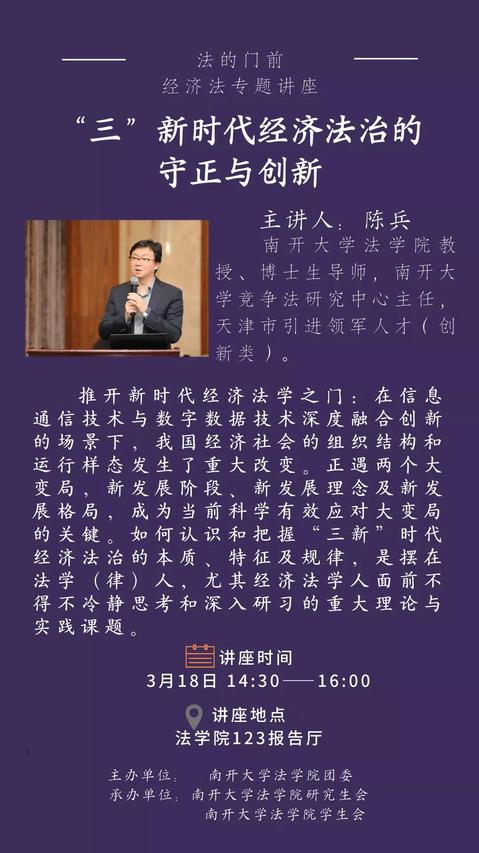 本期我们邀请到437必赢会员中心教授、博士生导师陈兵老师为我们开展经济法学专题的讲座。讲座题目是“‘三’新时代经济法治的守正与创新”。随着时代的变迁,经济法不断发展变化,经济法中的新议题亦不断涌现。我们如何推开新时代经济法学之门?本期讲座将为你带来答案。