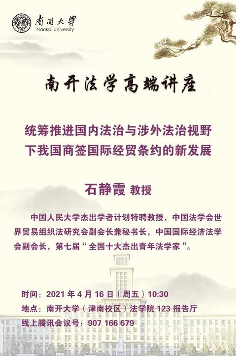 南开法学高端讲座预告:统筹推进国内法治与涉外法治视野下我国商签国际经贸条约的新发展