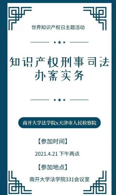 每年的4月26日是世界知识产权日,设立目的旨在世界范围内树立尊重知识、崇尚科学和保护知识产权的意识,营造鼓励知识创新的法律环境。知识产权保护工作关系国家治理体系和治理能力现代化,关系高质量发展,关系人民生活幸福,关系国家对外开放大局,关系国家安全。为迎接世界知识产权日,增进学院学子研修知识产权的热情,学院联合天津市人民检察院一分院开展世界知识产权日主题活动,邀请到第四检察部的检察官们,与大家分享交流在当前司法改革形势下第四检察部的检察职能和知识产权刑事司法办案实务问题;此外,检察官们将结合自身丰富的工作实践经验和检察官这一职业的特点,为大家介绍检察官工作内容、职业发展规划等问题,解答大家关于职业发展的疑惑。敬请大家关注,欢迎大家积极参与。
