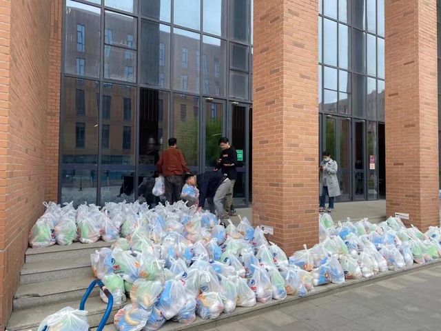 在学校的支持下,学院党委购置了涵盖水果、饮品、零食等丰富品类的物资。志愿者们来到物美超市,组成“流水”作业线,协助分装、打包、转运物资。分工有序,配合高效,陆续将七百余份物资打包整理好,运往学院、宿舍楼各个物资分发点。