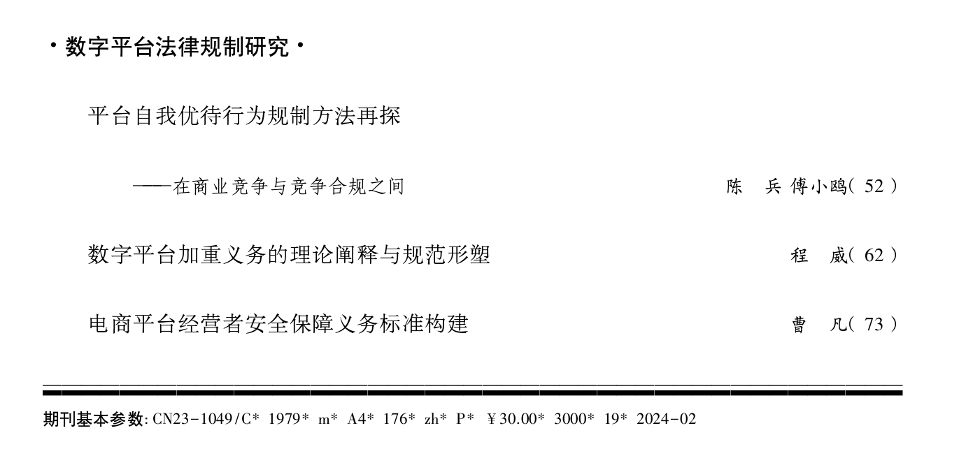 我院陈兵教授在《学习与探索》发表文章《平台自我优待行为规制方法再探——在商业竞争与竞争合规之间》。文章认为,平台企业具有“经营者”和“管理者”双重身份,商业逐利本性会驱使其利用技术手段、平台规则等对自身产品或服务给予优先待遇。自我优待是较为常见的一种商业现象,从商业竞争角度来看固然无可厚非,但从竞争合规角度出发则可能会不当排斥、妨碍其他经营者合法提供的产品或服务的接入和交易,从而影响公平竞争的市场环境。从反垄断法来分析自我优待行为的违法性,可以从经营者的市场支配地位与自我优待行为发生机理两方面加以阐释,前者主要是行为者具有让其平台内经营者无从选择的市场力量,后者主要指行为者不正当利用平台内经营者的竞争资源为自身获取竞争优势,两者同时具备方能构成反垄断法上的违法。基于此,建议采取科学审慎的态度,立足常态化监管,从规制理论和实践正当性两个维度设计方案。